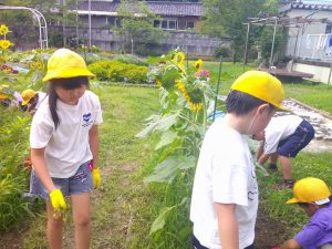3年生はひまわりを育てています。ぐんぐんと大きくなりました。でも、雑草も育ちます。暑い中、3年生はひまわりの成長ために一生懸命草取りをしています。ひまわりは3年生の愛情をたっぷり受けて元気に育っているのですね。もっともっとひまわりが育てばよいですね。楽しみですね。