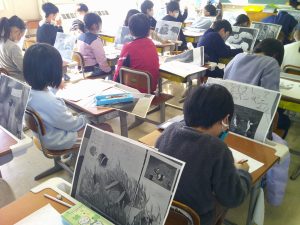 2年生は図画工作科の学習を頑張っています。今日は版画の下絵を描いていました。題材は「~している生き物」です。一人一人が選んだ生き物を描いていました。ペンギン、てんとうむし、カマキリ、ワニ…いろいろです。細かく見ながら一生懸命でした。