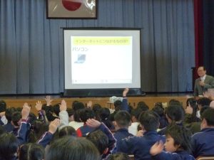 今日は、講師の先生をお招きして、ネット対策フォローアップ事業「ネットトラブル防止講演会」を開催しました。全校で参加し、ネットの便利さと怖さを学びました。また、家の人や先生方に相談しながら、ネットを上手に活用することも学びました。宮田っ子のメディアルールに活かしていきます。