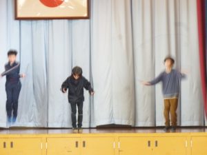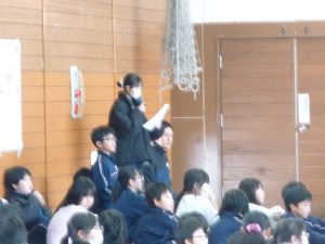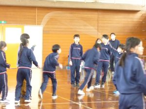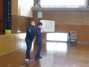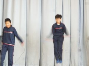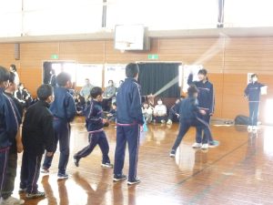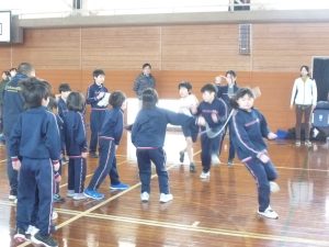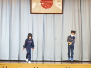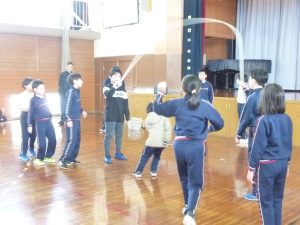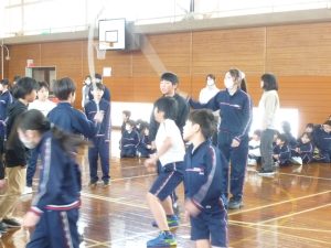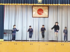 最初に、模範演技を行いました。代表者が「二重跳び、サイドクロス、二重あや跳び、8の字跳び、ダブルダッチ等」の技を見せてくれました。