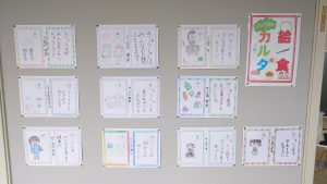 また、廊下には、毎日おいしい給食を作ってくださる栄養教諭や調理員への感謝の手紙や給食カルタを掲示しました。