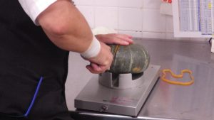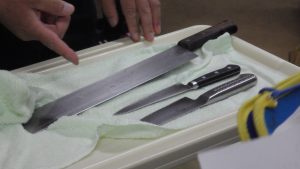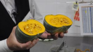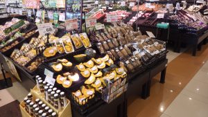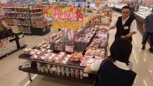 まずは、野菜や果物売り場について説明していただきました。入店してすぐに目に入るように、入口近くには、旬の野菜や果物を置いていることが分かりました。同じ種類の野菜や同じ料理に使う野菜などは、近くに置いておくことで、お客さんに買い物をしやすくしているそうです。また、様々な世帯に合わせて、野菜や果物をカット売りをしていることも学びました。特注の包丁を使うことで、とても硬いかぼちゃもきれいにカットできるそうです。