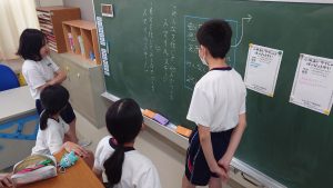 昼休み、代表委員が集まって今年度の学習発表会のスローガンについて話し合いました。「こんな学習発表会にしたい!」という想いが伝わるよう、キーワードに込められた意味を考え、スローガンを完成させました。完成したスローガンは、「自分を信じ みんなでつくる スマイルステージ」です。