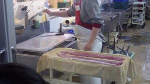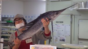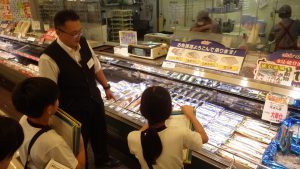 次は、鮮魚売り場です。その日の朝、競りにかけられていた魚をさばいている様子を見学しました。刺身やお寿司は、見た目が美しくなるよう工夫し、徹底した温度管理をして、お客さんがおいしいと感じるように努力しているそうです。