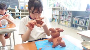 講師の方の話を参考に、子供たちは粘土をこねながら、シーサーの目や口、歯をどうしようか考えました。つまようじで体の模様をつけたり、余った粘土でシーサーの子供をつくったりするなど、個性豊かなシーサーが完成しました。