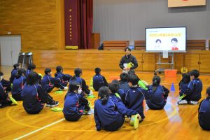 はじめに、子供たちは今井先生の話をよく聞き、ボールドリブル等の基礎となる動きを楽しみました。
