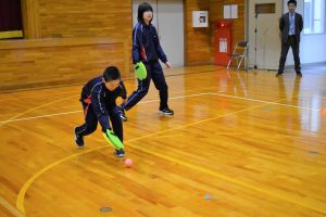 その後、子供の実態に合わせて、ルールの説明がありました。「キャッチしてから打ち返す」「2バウンドまでにキャッチできたらセーフ」などのルールに従って、テニピンを行いました。
