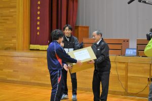 まず、授賞集会です。バレーボールや卓球で優秀な成績を収めた2名の児童が、校長先生から賞状を受け取りました。努力の成果が認められ、全校から大きな拍手が送られました。