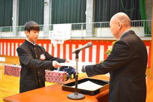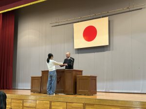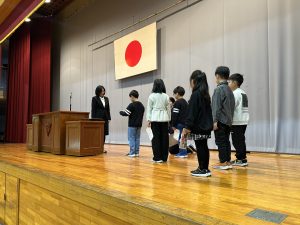 5年生の児童が全校を代表して修了証を受け取り、今年度の学びを締めくくりました。校長先生からは、この1年間の行事や日々の頑張りを振り返り、子供たちの成長を讃えるお話がありました。