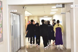 卒業式当日の朝、卒業生は晴れやかな表情で登校してきました。玄関では、新しい制服を身にまとった卒業生を、5年生が温かく迎えました。