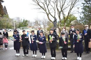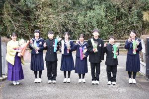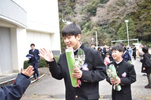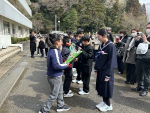 式の途中には、強い風が吹き雨が降るときもありましたが、歓送の集いのときにはすっかり上がり、陽も差してきました。5年生から花束が贈られ、在校生や教職員、家族に見送られながら、卒業生は学び舎を後にしました。