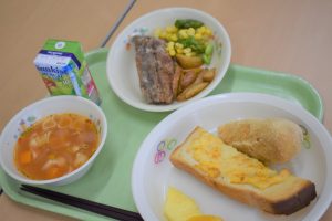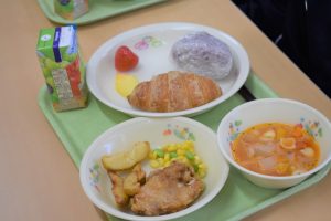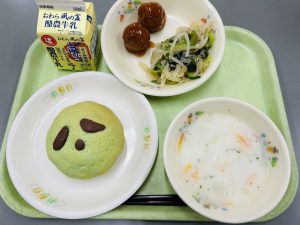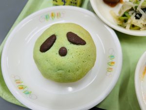 この日の給食は、リクエスト献立の「パンダメロンパン」でした。