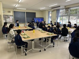 今日の給食には、長坂棚田米で作った炊き込みご飯、女良わかめのすまし汁、灘浦みかんのデザートなど、灘浦の「うまいもん」がたくさん使われており、地域の恵みを感じられる、灘浦小学校ならではの給食でした。子供たちも、おいしそうに味わいながら食べていました。