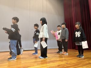 5年生は、6年生との思い出を振り返る劇を発表しました。心に残る出来事を楽しく表現し、会場はみんなの笑いに包まれました。