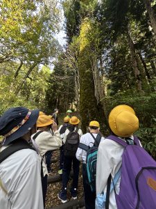 予定した時刻より早く終わったため、近くにあった長坂の大イヌグスを見学しました。子供たちは、写真では分からなかった大イヌグスの大きさに驚いていました。そして、電気柵が設置されていたり、丸太の支柱で木の枝が支えられていたりしていることに気付き、地域の方々がふるさとの宝を大切に守っていることを知りました。