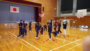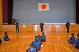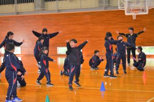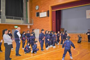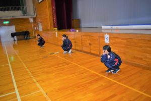 次は「やきいもクイズ」と「やきいもじゃんけん」をしました。音楽に合わせて行う「やきいもじゃんけん」では、前に立つ6年生に負けないようにと、体全体を動かして勝負を楽しんでいました。