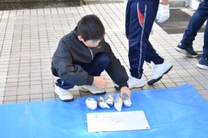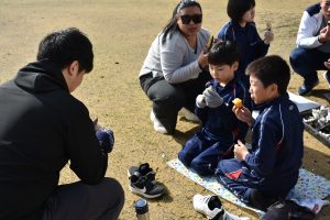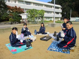グラウンドにレジャーシートを広げ、班ごとに輪になって座り、焼きたてのお芋をいただきました。