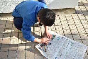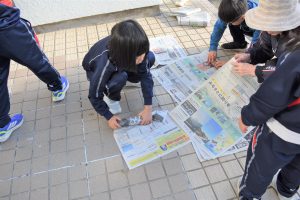 新聞紙でサツマイモを包み、水でしめらせてからアルミホイルで巻いていきます。焼き上がりを想像しながら、わくわくした表情で丁寧に準備をしていました。