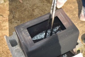 牛乳パックに火をつけ、槇をくべながら火力が安定するように調節します。