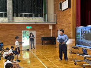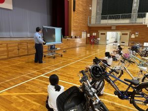 その後、宇波駐在所の方のお話を聞きました。「歩道を歩くこと」「飛び出しをしないこと」「信号を守ること」の大切さを教えていただきました。