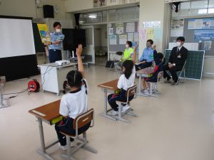 灘浦小と海峰小の混合グループで、館内7カ所に設置された「循環に関するクイズ」をめぐるクイズラリーをしました。みんなで協力してクイズポイントを探し、答えを考えたら、お腹が空きました。