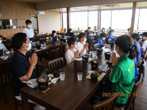 漁師の朝ご飯「かぶす汁」をみんなでいただきました。お刺身も付いてとてもおいしかったです。