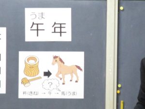 また、「午年」の「うし」はなぜ「午」と書くのかという問いかけがあり、漢字の成り立ちとして、杵(きね)→午→馬(うま)へと変化してきたという語源についても紹介されました。さらに、「なぜ杵が馬になったのか」という疑問については、分からないことをそのままにせず、自分で調べることの大切さについても話され、この謎はぜひ自分で調べてみてほしいと呼びかけられました。