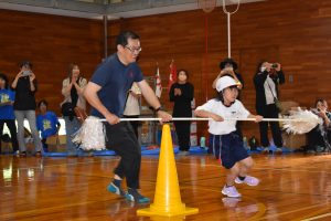 今年も灘浦小学校に台風がやってきました!親子で協力し、ぐるぐる回ります。