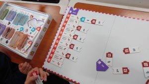 主人公を思い通りに動かす命令について、それぞれの考えを具体的な言葉で伝え合い、順序立てて並べられるように、協力して取り組んでいました。