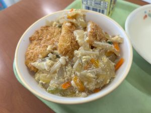 この日は、大きなとんかつに自分でカツ丼のたれをかけて仕上げるスタイル。子供たちは好きなタイミングでたれをのせ、できたてのカツ丼をおいしそうに味わっていました。