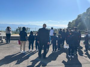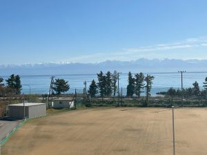 避難訓練の後は、海の向こうに広がる立山連峰の景色を全員で眺めました。
