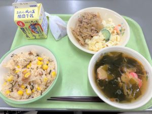 今日の給食には、長坂棚田米で作った炊き込みご飯、女良わかめのすまし汁、灘浦みかんのデザートなど、灘浦の「うまいもん」がたくさん使われており、地域の恵みを感じられる、灘浦小学校ならではの給食でした。子供たちも、おいしそうに味わいながら食べていました。