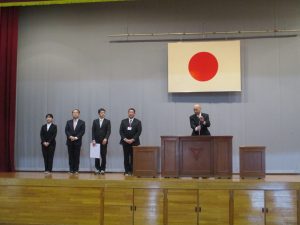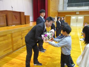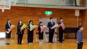 まず始めに、離任式を行いました。6名の教職員の方々が灘浦小学校を離れ、新しい勤務校に異動されました。これまでお世話になった感謝の気持ちと、これからのご活躍を願う気持ちを込めて、全校児童でお見送りしました。灘浦小学校を離れられても、変わらずお元気でご活躍されることを願っています。