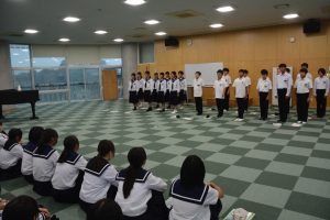10月20日(月)の4時間目に3年2組と1年2組が合同合唱を行いました。