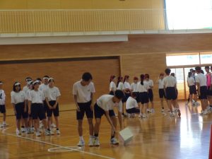 3年生が、1・2年生に応援合戦での動きを教えます。
