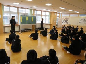 終業式の後、後期生徒会執行部が活動スローガン「やってみよう」を披露しました。