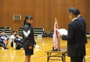 まず、前期生徒会長が、運動会等の前期生徒会活動への協力について、全校生徒に感謝の気持ちを伝える退任の挨拶をしました。