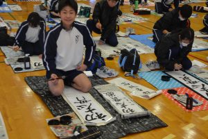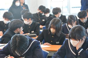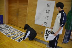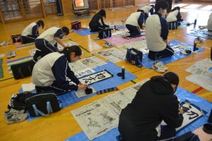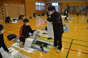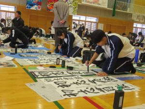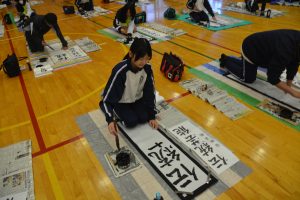 1年生は楷書で「伝統芸能」、2年生は行書で「文学の地」、3年生は行書で「初志貫徹」の字を書きました。どれも、全体のバランスや筆運びの難しい字ですが、生徒たちは手本を確認しながら、丁寧に書き進めていました。