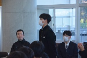 財団を代表して、北陸銀行氷見支店の支店長、副支店長にご来校いただき、ご挨拶の後に、校長先生からの謝辞と男女ハンドボール部からのお礼の言葉をお伝えしました。