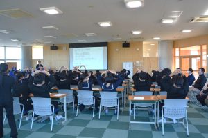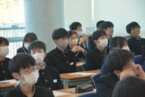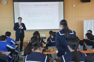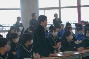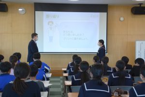 講師の先生からの質問に答える場面では、積極的に挙手をして質問や意見を述べる姿が見られました。最後には代表生徒が、学んだことをこれからの生活に活かしていきたいと決意を述べました。
