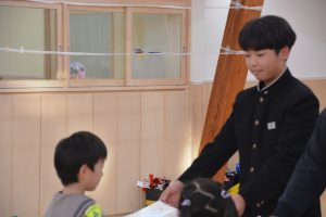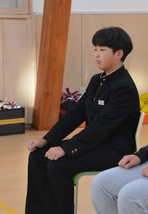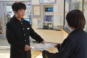 児童生徒を代表して、南部中学校後期生徒会長が「氷見を明るくしていきたいと思っているので、ぜひ掲示をお願いします。」と伝え、掲示物を手渡しました。