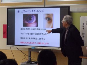 学校医の先生からは、コンタクトレンズを正しく使うことの大切さや、メディアが健康に及ぼす影響について詳しくご指導いただきました。