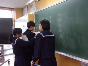 答えが分かった人は、黒板に英単語を書きにきます。