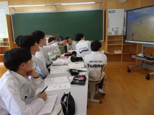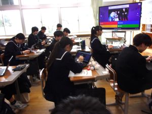 本校の会場で大会役員をしている男子ハンドボール部員も、仕事の合間に控室の電子黒板で観戦し、声援を送りました。