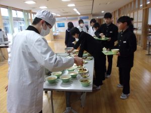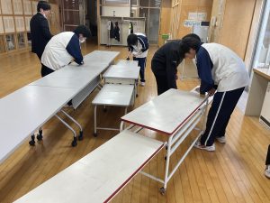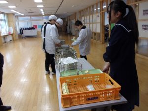 本日、給食委員会の生徒たちが、配膳台清掃を行いました。