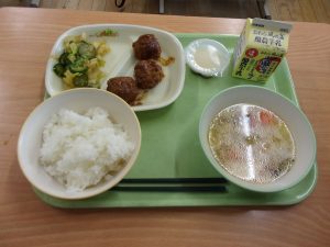 今日のメニューは、ご飯、牛乳、みそだれ肉団子、きゅうりのナムル、ワンタンスープ、ミニプリンでした。