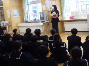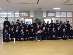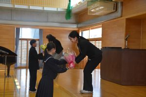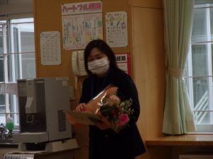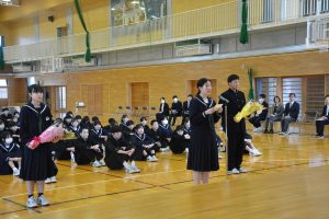 教頭先生のお話の後、生徒代表による感謝の言葉や色紙・花束を贈呈しました。