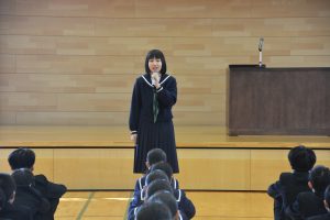2年生の代表の生徒は、生徒会活動等で学校の中心となって行動する大変さや責任感を感じた経験を振り返り、最高学年としての来年度への抱負を述べました。