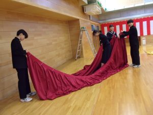 3年生に感謝の気持ちを込めて、丁寧に紅白幕をかけたり、椅子やピアノを運び込んだりと、準備を一生懸命に行いました。