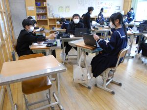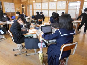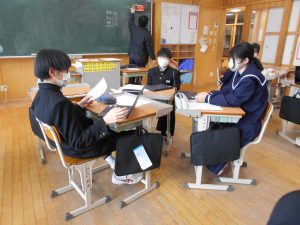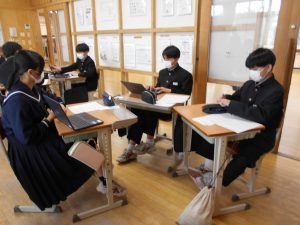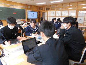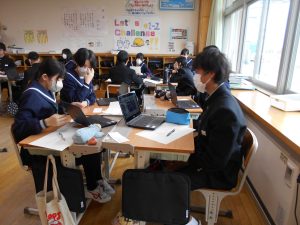 発表後は、生徒同士で「相互評価」を行いました。「スライドが見やすかった」「聞こえやすい声でとても聞きやすかった」「調査資料が多くて、内容が分かりやすかった」など、仲間の発表の素晴らしい点に気付くことで、新たな学びを得る貴重な時間となりました。
